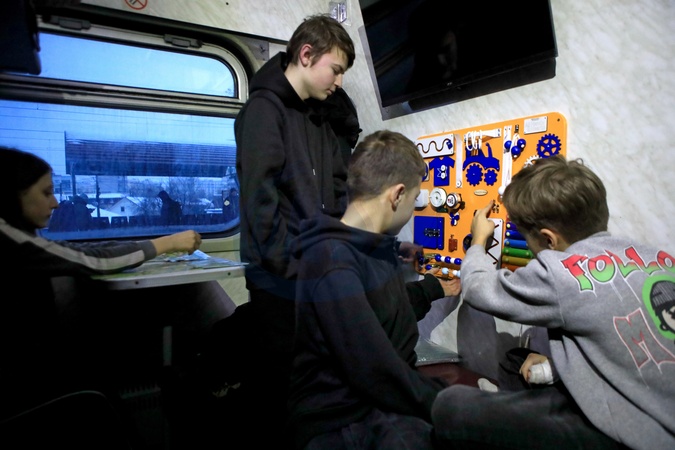 Boys play with an easyboard inside an invincibility wagon installed at the railway station in Vyshneve as part of a joint initiative by Ukrzaliznytsia and the Kyiv Regional Military Administration to support residents during power and heating outages caused by Russian attacks on Ukraine's energy facilities, Kyiv region, Ukraine, on January 28, 2026, Credit:Volodymyr Tarasov / Avalon