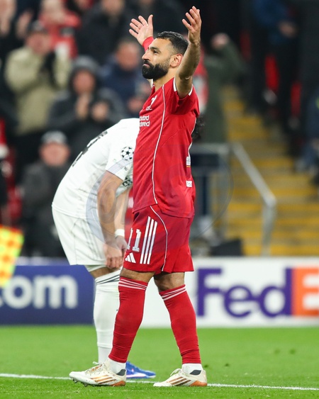 Mohamed Salah of Liverpool celebrates after making it 3-0 during the UEFA Champions League Match Day 8 of 8 match Liverpool vs Qarabag FK at Anfield, Liverpool, United Kingdom on 28 January 2026, Credit:Jorge Horsted/News Images / Avalon