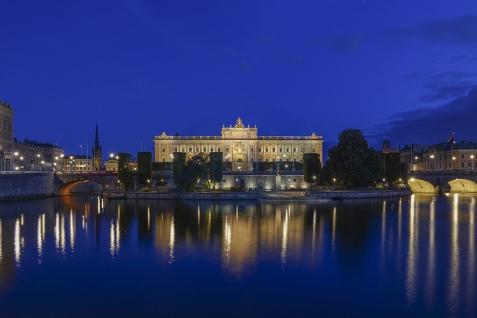 Sweden, Stockholm, Riksdagshuset (Parliament House) night view, Credit:Fabio Mazzarella / Avalon