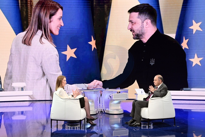 Rai1, television program Porta a Porta. Pictured is journalist Bruno Vespa with Roberta Metsola, President of the European Parliament; in the background is an image of Zelensky. Rome, Italy 29 Janauary 2026, Credit:Maria Laura Antonelli / Avalon