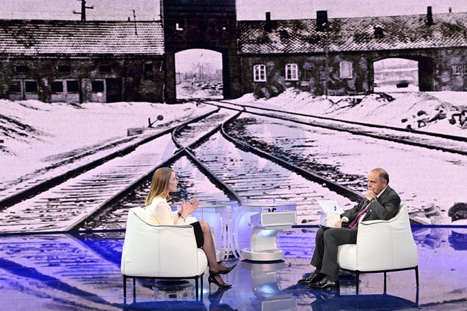 Rai1, television program Porta a Porta. Pictured is journalist Bruno Vespa with Roberta Metsola, President of the European Parliament, with the Auschwitz concentration camp in the background. Rome, Italy 29 Janauary 2026, Credit:Maria Laura Antonelli / Avalon