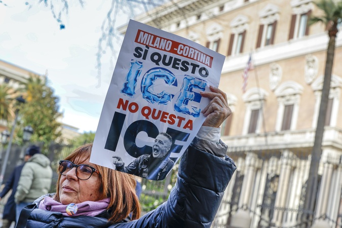 January 29, 2026, Rome, Sit-in protest against the presence of the American police ICE at the 2026 Milan Cortina Olympics. In the photo, a poster with the words "Yes to this ICE, no to this ICE" and a photo of Greg Bovino, Credit:Cristiano Minichiello / Avalon