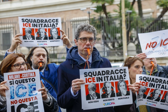 29/01/2026 Rome, Sit-in protest against the presence of the American ICE police at the Milan Cortina 2026 Olympics, in the photo Riccardo Magi holds a sign with an image of Giorgia Meloni, Antonio Tajani, Matteo Piantedosi., Credit:Cristiano Minichiello / Avalon