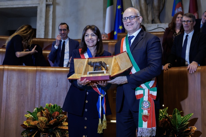 29/01/2026 Rome, Delivery of the Capitoline Wolf to the Mayor of Paris on the occasion of the 70th anniversary of the twinning between Rome and Paris. In the photo: Mayor of Rome Roberto Gualtieri and Mayor of Paris Anne Hidalgo., Credit:Francesco Fotia / Avalon