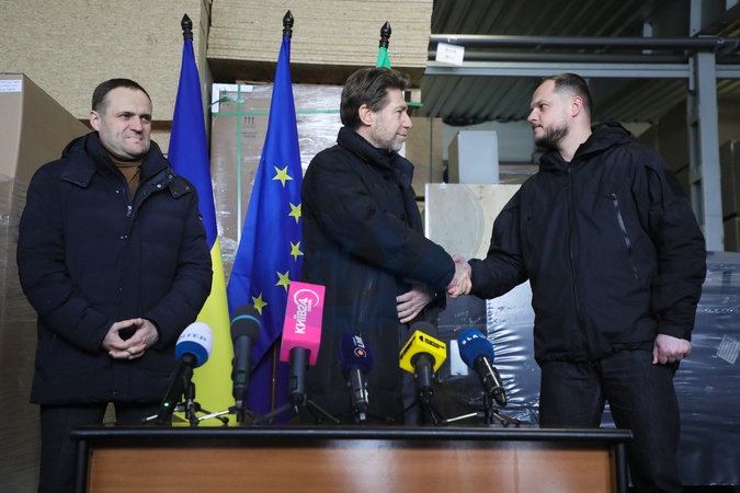 Deputy Prime Minister for Restoration of Ukraine - Minister for Communities and Territories Development of Ukraine Oleksii Kuleba, Ambassador Extraordinary and Plenipotentiary of the Italian Republic to Ukraine Carlo Formosa and Kyiv Regional Military Administration head Mykola Kalashnyk (L to R) participate in the transfer of 350 generators from Poland and boilers from the Italian government to Kyiv and communities across Ukraine to help overcome the energy crisis caused by Russian strikes on critical infrastructure, Kyiv region, Ukraine, January 29, 2026., Credit:Yuliia Ovsiannikova / Avalon