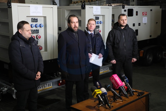 Deputy Prime Minister for Restoration of Ukraine - Minister for Communities and Territories Development of Ukraine Oleksii Kuleba, charge d'affaires a.i. of the Republic of Poland in Ukraine Piotr Lukasiewicz, Deputy Minister for Communities and Territories Development of Ukraine Artem Rybchenko and Kyiv Regional Military Administration head Mykola Kalashnyk (L to R) participate in the transfer of 350 generators from Poland and boilers from the Italian government to Kyiv and communities across Ukraine to help overcome the energy crisis caused by Russian strikes on critical infrastructure, Kyiv region, Ukraine, January 29, 2026., Credit:Yuliia Ovsiannikova / Avalon