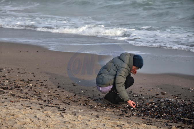 A woman picks up shells on Lanzheron Beach by the Black Sea on a warm winter day after a spell of cold weather, Odesa, Ukraine, January 29, 2026., Credit:Nina Liashonok / Avalon