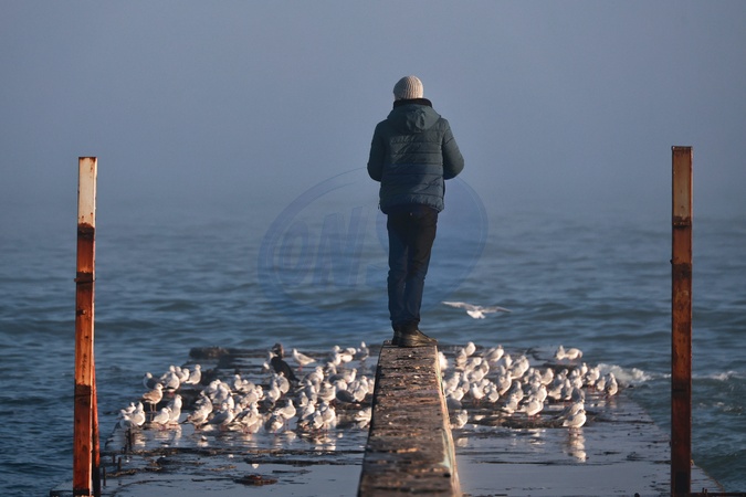 A man stands in front of seagulls perched on the pier jutting into the Black Sea on a warm winter day after a spell of cold weather, Odesa, Ukraine, January 29, 2026., Credit:Nina Liashonok / Avalon