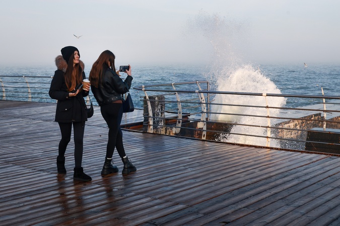 A girl takes a picture of a wave hitting the embankment by the Black Sea on a warm winter day after a spell of cold weather, Odesa, Ukraine, January 29, 2026., Credit:Nina Liashonok / Avalon