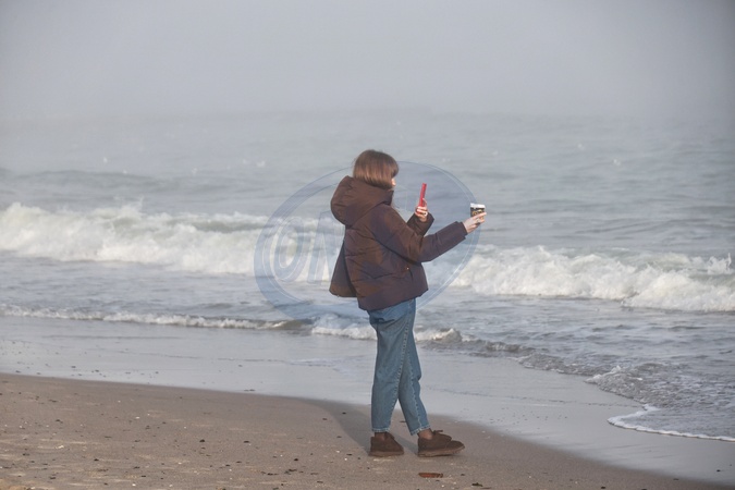 A woman takes a photo of a cup of coffee in front of the Black Sea on Lanzheron Beach on a warm winter day after a spell of cold weather, Odesa, Ukraine, January 29, 2026., Credit:Nina Liashonok / Avalon