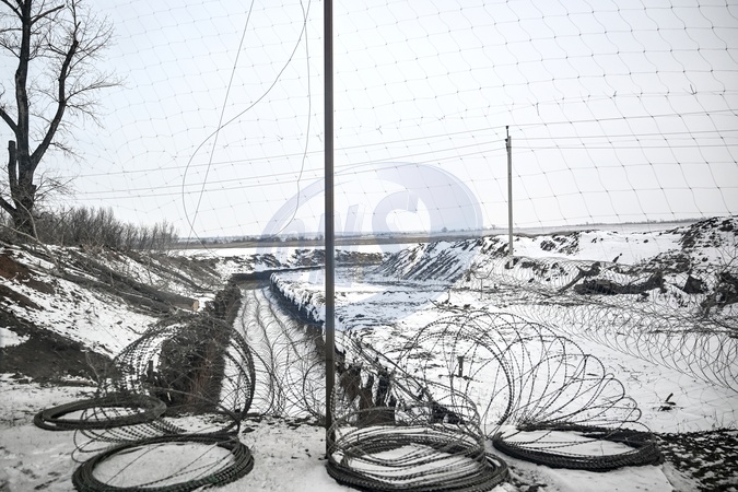 An anti-tank trench reinforced by barbed wire is seen through an anti-drone net covering the road to protect from Russian FPV drone strikes, Donetsk region, Ukraine, January 23, 2026., Credit:Dmytro Smolienko / Avalon