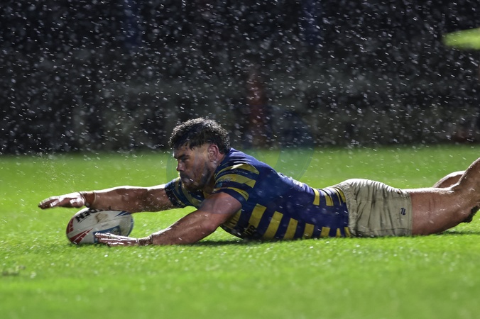 Joe Philbin of Warrington Wolves goes over for a try during the Pre Season match Warrington Wolves vs Leigh Leopards at Halliwell Jones Stadium, Warrington, United Kingdom, 30th January 2026, Credit:Mark Cosgrove/News Images / Avalon