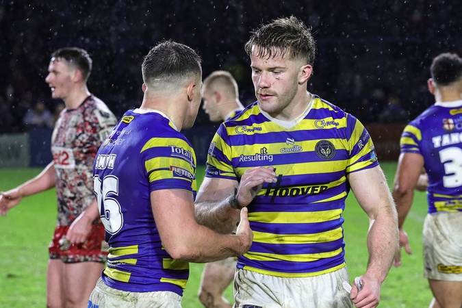 Josh Smith of Warrington Wolves and Luke Thomas of Warrington Wolves during the Pre Season match Warrington Wolves vs Leigh Leopards at Halliwell Jones Stadium, Warrington, United Kingdom, 30th January 2026, Credit:Mark Cosgrove/News Images / Avalon