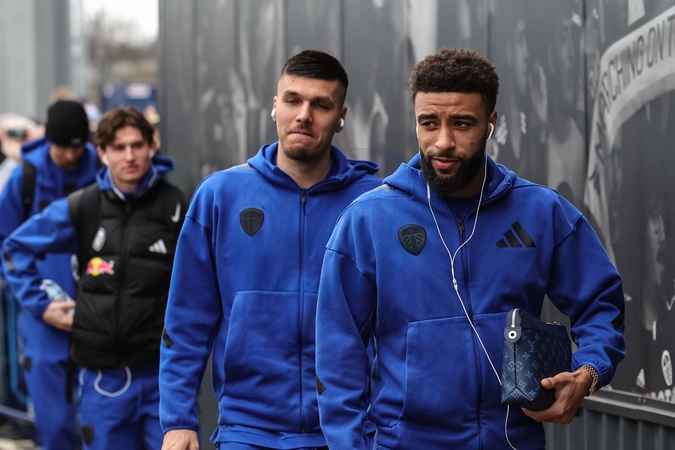 Jayden Bogle and Joel Piroe of Leeds United arrive during the Premier League match Leeds United vs Arsenal at Elland Road, Leeds, United Kingdom, 31st January 2026, Credit:Mark Cosgrove/News Images / Avalon