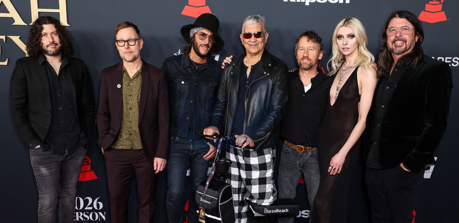 LOS ANGELES, CALIFORNIA, USA - JANUARY 30: Ilan Rubin, Nate Mendel, Rami Jaffee, Pat Smear and Chris Shiflett of Foo Fighters, Taylor Momsen and Dave Grohl of Foo Fighters arrive at the MusiCares 2026 Person of the Year Honoring Mariah Carey held at the Los Angeles Convention Center South Hall on January 30, 2026 in Los Angeles, California, United States., Credit:Xavier Collin / Avalon