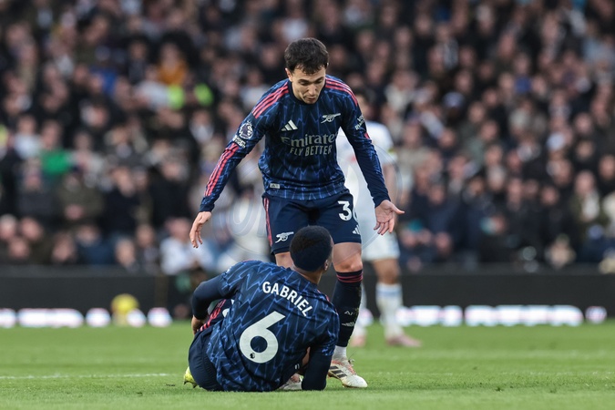 Martin Zubimendi of Arsenal checks on Gabriel of Arsenal during the Premier League match Leeds United vs Arsenal at Elland Road, Leeds, United Kingdom, 31st January 2026, Credit:Mark Cosgrove/News Images / Avalon