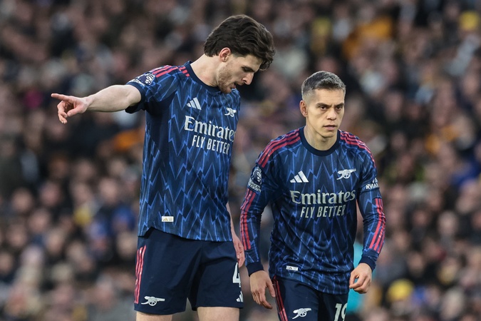 Declan Rice of Arsenal speaks to Leandro Trossard of Arsenal during the Premier League match Leeds United vs Arsenal at Elland Road, Leeds, United Kingdom, 31st January 2026, Credit:Mark Cosgrove/News Images / Avalon