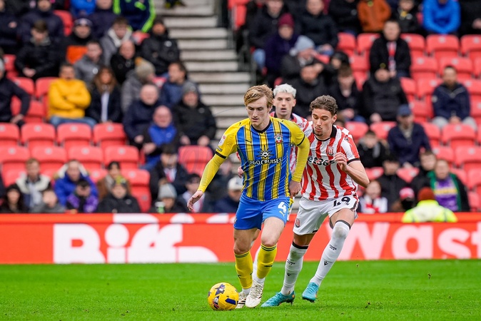 Flynn Downes of Southampton shields the ball from Milan Smit of Stoke City during the Sky Bet Championship match Stoke City vs Southampton at Bet365 Stadium, Stoke-on-Trent, United Kingdom, 31st January 2026, Credit:Maynard Manyowa/News Images / Avalon