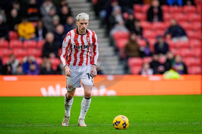 Tomas Rigo of Stoke City makes a run with the ball during the Sky Bet Championship match Stoke City vs Southampton at Bet365 Stadium, Stoke-on-Trent, United Kingdom, 31st January 2026, Credit:Maynard Manyowa/News Images / Avalon