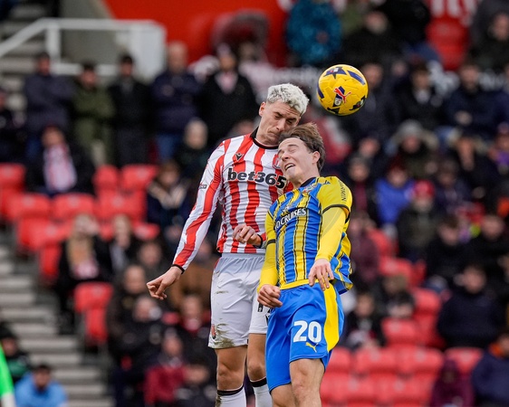 Tomas Rigo of Stoke City battles for the ball with Caspar Jander of Southampton during the Sky Bet Championship match Stoke City vs Southampton at Bet365 Stadium, Stoke-on-Trent, United Kingdom, 31st January 2026, Credit:Maynard Manyowa/News Images / Avalon