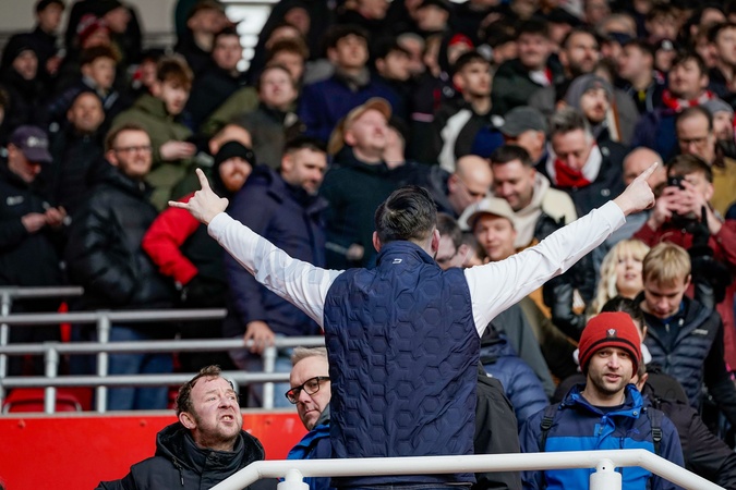 Southampton fans celebrate their team winning 0-2 at full time during the Sky Bet Championship match Stoke City vs Southampton at Bet365 Stadium, Stoke-on-Trent, United Kingdom, 31st January 2026, Credit:Maynard Manyowa/News Images / Avalon
