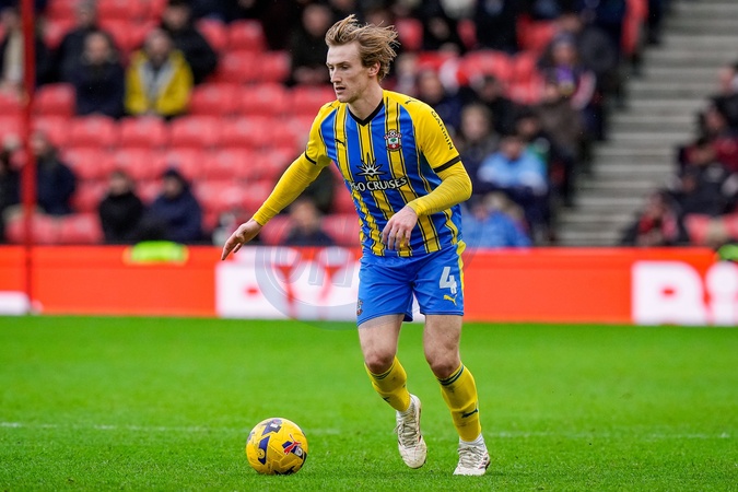 Flynn Downes of Southampton makes a run with the ball during the Sky Bet Championship match Stoke City vs Southampton at Bet365 Stadium, Stoke-on-Trent, United Kingdom, 31st January 2026, Credit:Maynard Manyowa/News Images / Avalon