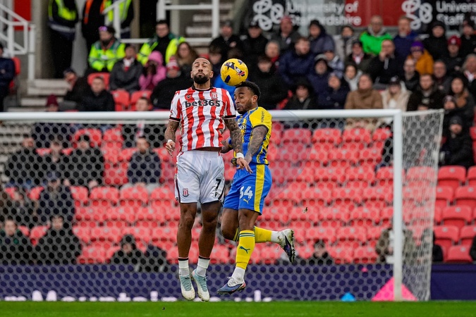 Welington of Southampton leaps to head the ball challenging Sorba Thomas of Stoke City during the Sky Bet Championship match Stoke City vs Southampton at Bet365 Stadium, Stoke-on-Trent, United Kingdom, 31st January 2026, Credit:Maynard Manyowa/News Images / Avalon