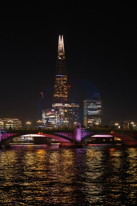 The Shard building seen by the River Thames at night in London.UK