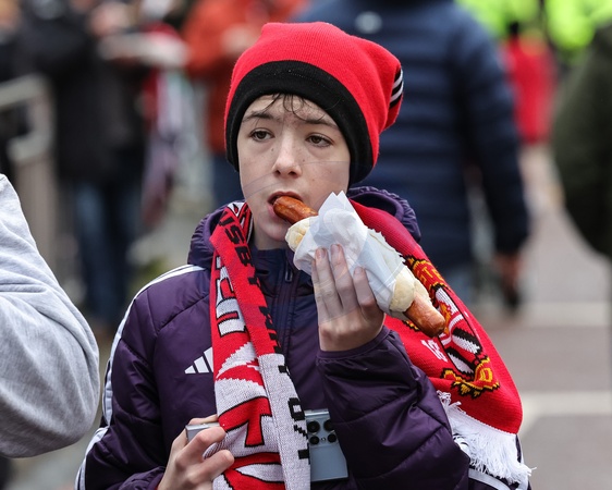 A young Manchester United fan eating a hotdog on his way to Old Trafford during the Premier League match Manchester United vs Fulham at Old Trafford, Manchester, United Kingdom, 1st February 2026, Credit:Mark Cosgrove/News Images / Avalon