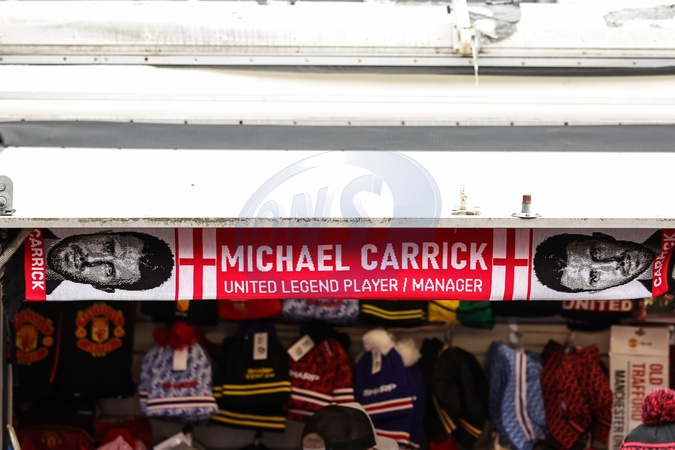 A Michael Carrick manager of Manchester United scarf on sale during the Premier League match Manchester United vs Fulham at Old Trafford, Manchester, United Kingdom, 1st February 2026, Credit:Mark Cosgrove/News Images / Avalon