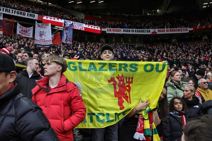 A Manchester United fan holds cup a Glazers out banner as part of todays planned protests during the Premier League match Manchester United vs Fulham at Old Trafford, Manchester, United Kingdom, 1st February 2026, Credit:Mark Cosgrove/News Images / Avalon