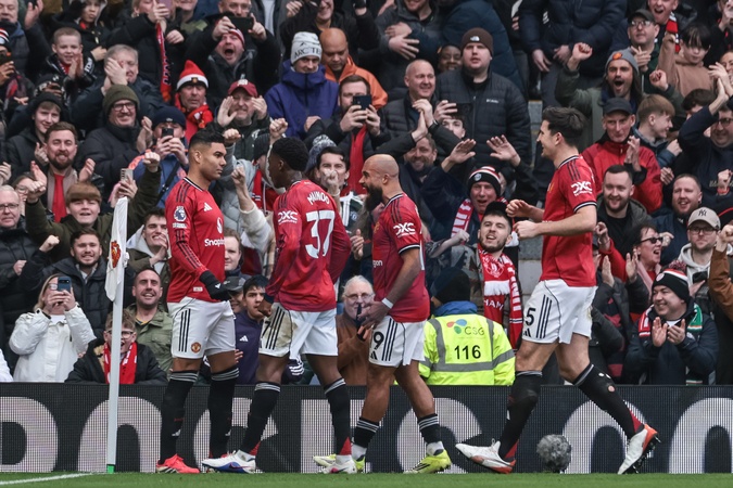 Casemiro of Manchester United celebrates his goal to make it 1-0 during the Premier League match Manchester United vs Fulham at Old Trafford, Manchester, United Kingdom, 1st February 2026, Credit:Mark Cosgrove/News Images / Avalon