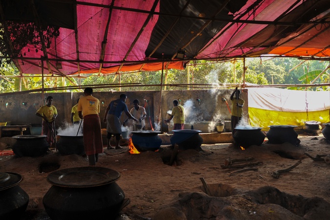 Chattogram, Bangladesh- Volunteers prepare communal Holy meals in large pots for pilgrims at the Rishi Kumbh Mela in Banshkhali, Chattogram, Bangladesh. Rishi Kumbh Mela is a major Hindu pilgrimage and cultural gathering held in the Rishi Dham area of Banshkhali Upazila, Chattogram, Bangladesh. Recognized as the country's only international Rishi Kumbh, the fair takes place approximately every three years and serves as a significant event for spiritual devotion, religious education, and social unity among Hindu communities., Credit:Md Rafayat Haque Khan / Avalon