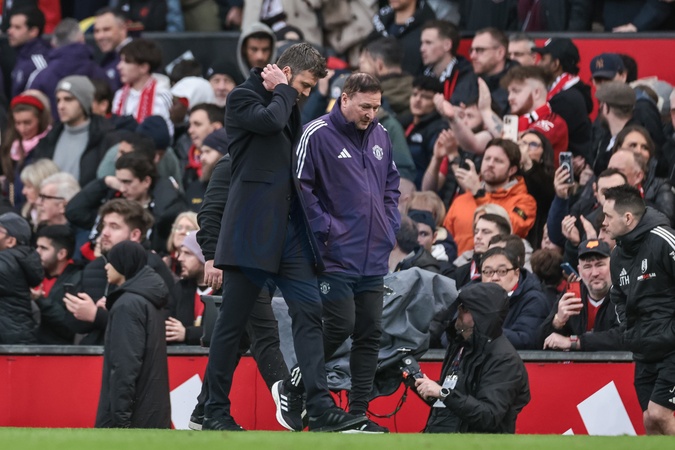Michael Carrick manager of Manchester United heads to the dressing room at half time a goal up during the Premier League match Manchester United vs Fulham at Old Trafford, Manchester, United Kingdom, 1st February 2026, Credit:Mark Cosgrove/News Images / Avalon