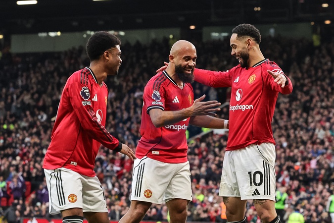 Matheus Cunha of Manchester United celebrates his goal to make it 2-0 with Amad Diallo and Bryan Mbeumo during the Premier League match Manchester United vs Fulham at Old Trafford, Manchester, United Kingdom, 1st February 2026, Credit:Mark Cosgrove/News Images / Avalon
