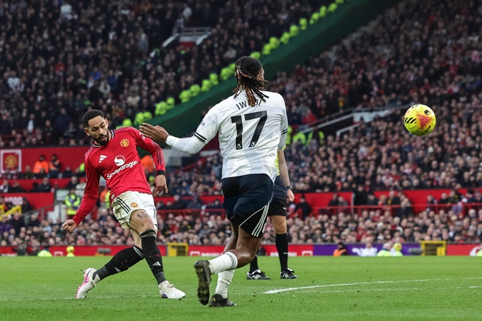 Matheus Cunha of Manchester United shoots on goal during the Premier League match Manchester United vs Fulham at Old Trafford, Manchester, United Kingdom, 1st February 2026, Credit:Mark Cosgrove/News Images / Avalon