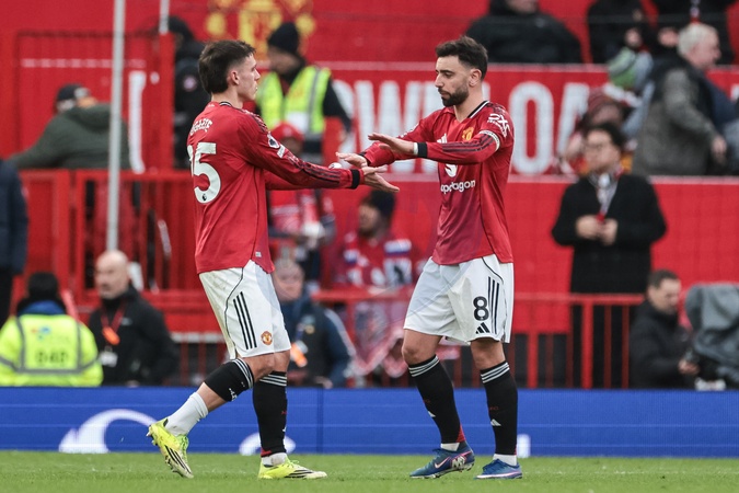 Manuel Ugarte and ,Bruno Fernandes celebrate their 3-2 win during the Premier League match Manchester United vs Fulham at Old Trafford, Manchester, United Kingdom, 1st February 2026, Credit:Mark Cosgrove/News Images / Avalon