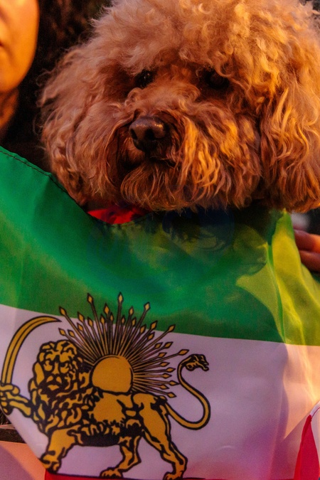 A growing group of four legged activists are spotted at the Iranian protests in London.In Iran, dogs are banned and even executed to protect "public order, health, and safety.” and their owners arrested.These 'Pooches for Pawlavi' joining their humans in the fight to free Iran from the Islamic Republic and bring back the Pahlavi Monarchy., Credit:Photo by Amanda Rose / Avalon