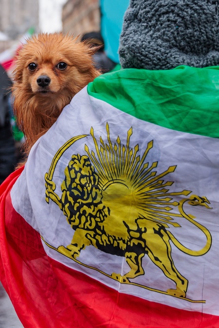 A growing group of four legged activists are spotted at the Iranian protests in London.In Iran, dogs are banned and even executed to protect "public order, health, and safety.” and their owners arrested.These 'Pooches for Pawlavi' joining their humans in the fight to free Iran from the Islamic Republic and bring back the Pahlavi Monarchy., Credit:Photo by Amanda Rose / Avalon