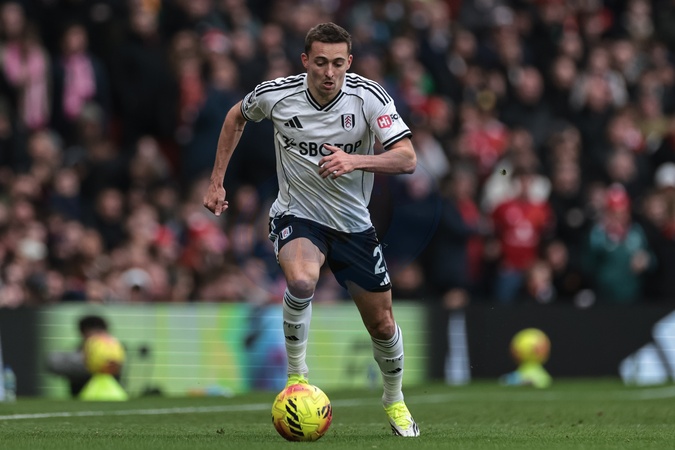 Timothy Castagne of Fulham breaks with the ball during the Premier League match Manchester United vs Fulham at Old Trafford, Manchester, United Kingdom, 1st February 2026, Credit:Mark Cosgrove/News Images / Avalon
