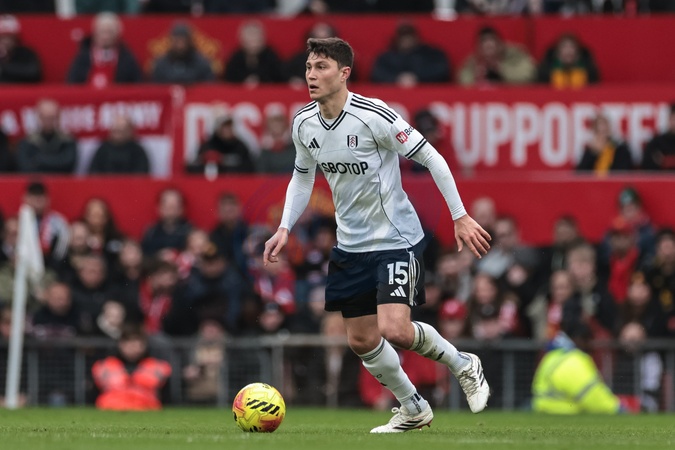 Jorge Cuenca of Fulham with the ball during the Premier League match Manchester United vs Fulham at Old Trafford, Manchester, United Kingdom, 1st February 2026, Credit:Mark Cosgrove/News Images / Avalon