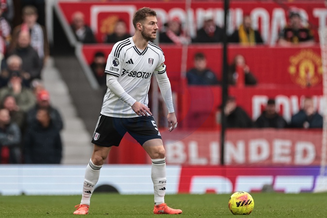 Joachim Andersen of Fulham with the ball during the Premier League match Manchester United vs Fulham at Old Trafford, Manchester, United Kingdom, 1st February 2026, Credit:Mark Cosgrove/News Images / Avalon
