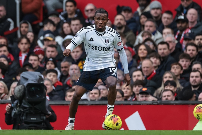 Samuel Chukwueze of Fulham breaks with the ball during the Premier League match Manchester United vs Fulham at Old Trafford, Manchester, United Kingdom, 1st February 2026, Credit:Mark Cosgrove/News Images / Avalon