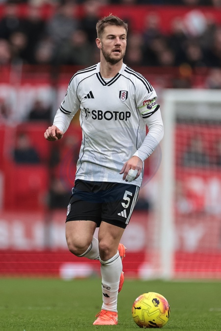 Joachim Andersen of Fulham with the ball during the Premier League match Manchester United vs Fulham at Old Trafford, Manchester, United Kingdom, 1st February 2026, Credit:Mark Cosgrove/News Images / Avalon