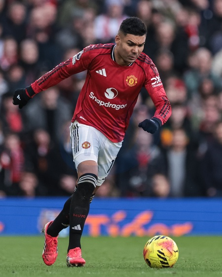 Casemiro of Manchester United with the ball during the Premier League match Manchester United vs Fulham at Old Trafford, Manchester, United Kingdom, 1st February 2026, Credit:Mark Cosgrove/News Images / Avalon