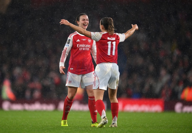 LONDON, ENGLAND - FEBRUARY 01: Lotte Wubben-Moy of Arsenal celebrates scoring her team's second goal with teammate Katie McCabe during the FIFA Women's Champions Cup 2026 Final match between Arsenal Women FC and SC Corinthians at Arsenal Stadium on February 01, 2026 in London, England., Credit:JB1 / SL / Avalon
