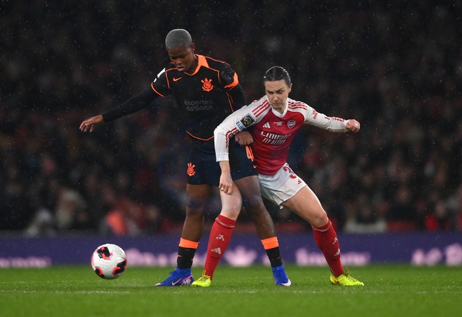LONDON, ENGLAND - FEBRUARY 01: Jhonson of SC Corinthians is challenged by Lotte Wubben-Moy of Arsenal during the FIFA Women's Champions Cup 2026 Final match between Arsenal Women FC and SC Corinthians at Arsenal Stadium on February 01, 2026 in London, England., Credit:TIM / SL / Avalon
