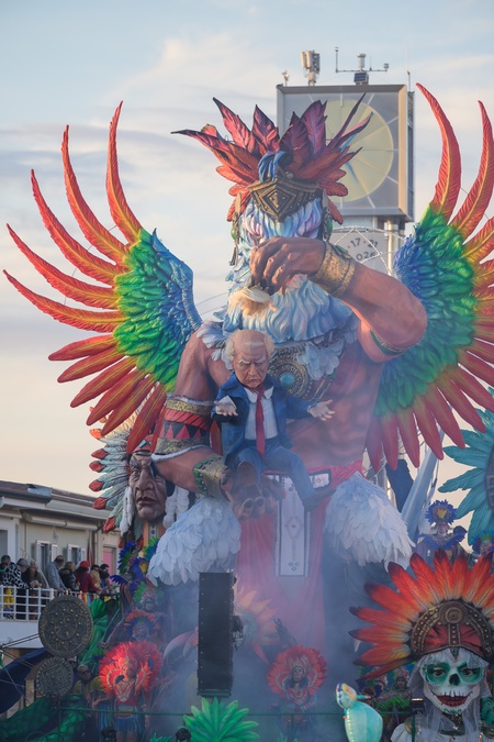 First masked parade of the Viareggio Carnival 2026. In the photo, the second category float "Native American Return" by Fabrizio and Valentina Galli with the Tump mask being scalped . Viareggio, Italy 01 Feb 2026, Credit:Stefano Dalle Luche / Avalon