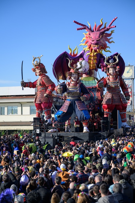 First masked parade of the Viareggio Carnival 2026. In the photo, the first category float "The Samurai of Power" by Luigi Bonetti with the masks of Trump, Putin and Xi Jinping dressed as samurai . Viareggio, Italy 01 Feb 2026, Credit:Stefano Dalle Luche / Avalon