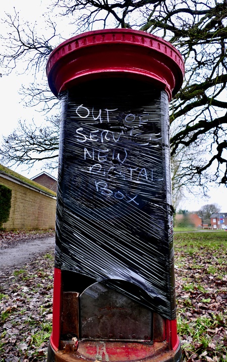 A sealed up post box due to be converted to digital. Royal Mail is introducing 3,500 solar-powered postboxes across the UK, altering the iconic look of the red pillar boxes that have punctuated Britain's streets for nearly two centuries.In the new design, solar panels on the top of the postboxes power a digitally-activated drawer, allowing customers to deposit small parcels., Credit:Geoffrey Swaine / Avalon